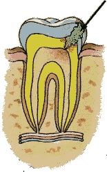 Without proper control of dental plaque and sugar intake, acids will continue to dissolve the enamel and the lesion will reach the dentine. The tooth becomes sensitive to hot and cold. When enough of the sub-surface enamel is weakened by the loss of minerals, the outer layer of the enamel collapses, forming a dental cavity. The decayed area must be cleaned and the cavity filled by a dentist. At this stage of tooth decay a dental filling is required to restore the tooth and prevent further damage.